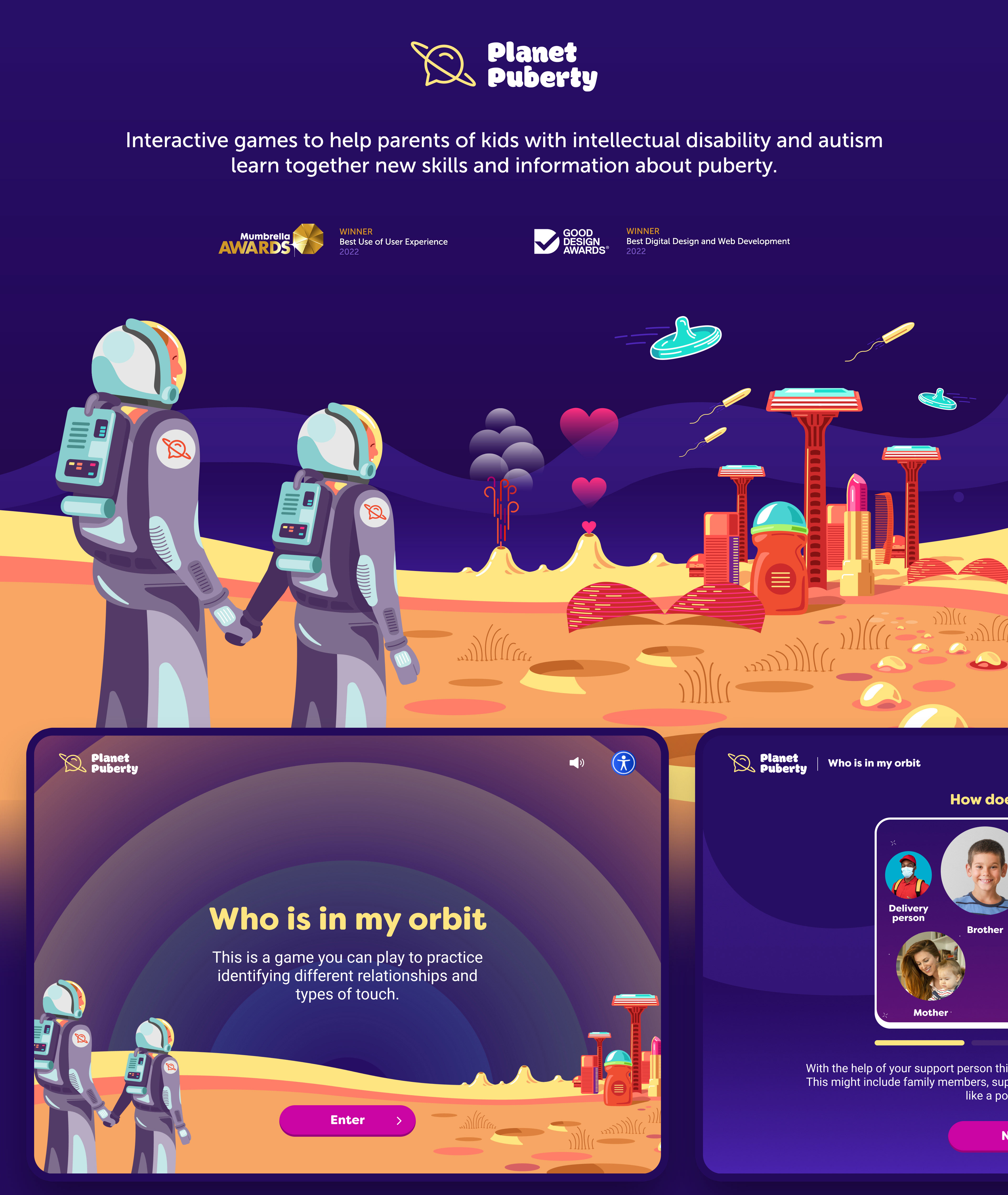 How can we help the parents and carers of children with autism or intellectual disability to navigate puberty? The brief from Family Planning NSW was to create a first-of-its-kind gaming platform that helped parents reinforce the planet puberty learnings with interactive and engaging games for kids and teens.